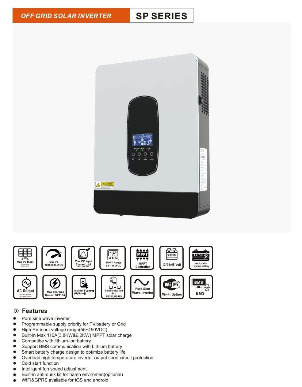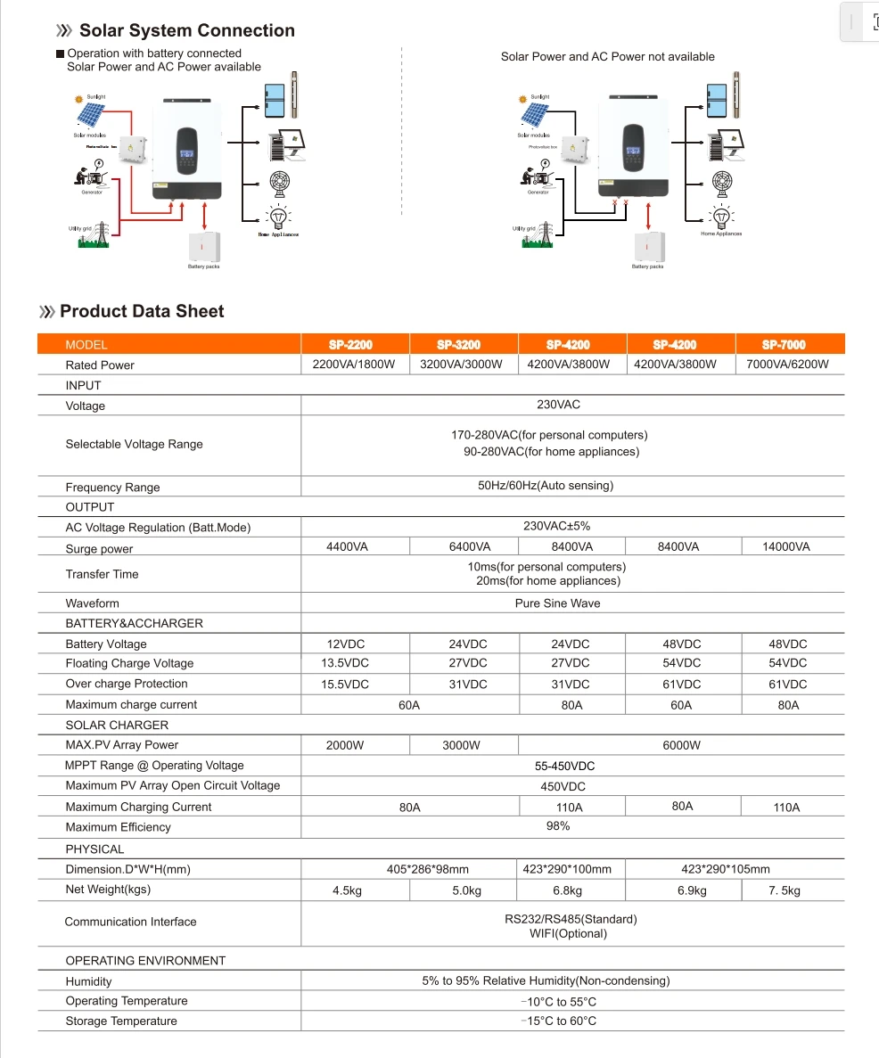 Specifications: AC Output: 220V 4200VA/3800W Pure Sine Wave Inverter: Yes Programmable Supply Priority: PV, Battery, or Grid High PV Input Voltage Range: 55~450VDC MPPT Solar Charge: Built-in Max 110A (3.6KW & 6.2KW) Compatible with Lithium-ion Battery: Yes Support BMS Communication: Yes (BMS/WIFI same port, optional) Smart Battery Charge Design: Optimizes battery life Overload, High Temperature, Inverter Output Short Circuit Protection: Yes Cold Start Function: Yes Intelligent Fan Speed Adjustment: Yes Built-in Anti-dusk Kit: Optional (for harsh environments) UPS Function: Yes Features: **Uninterrupted Power and Efficiency** The 4200va 3800W Hybrid Function Solar Inverter is a state-of-the-art power solution designed for off-grid applications. With its pure sine wave output, this inverter ensures a clean and stable power supply, making it ideal for sensitive electronics and appliances. The programmable supply priority feature allows you to prioritize power from the PV array, battery, or grid, ensuring optimal energy usage and efficiency. The high PV input voltage range of 55~450VDC accommodates a wide range of solar panel systems, making it a versatile choice for various solar setups. **Advanced Charging and Battery Management** Equipped with a built-in Max 110A MPPT solar charger, this hybrid solar inverter is designed to maximize energy harvest from your solar panels. It is compatible with lithium-ion batteries, offering a smart battery charge design that prolongs battery life. The inverter also supports BMS communication, allowing for seamless integration with lithium batteries and optional WIFI connectivity for remote monitoring and control. The intelligent fan speed adjustment ensures optimal cooling, while the built-in anti-dusk kit is a valuable addition for harsh environments, ensuring reliable performance in challenging conditions. **Reliable and User-Friendly** Safety and reliability are at the forefront of this inverter's design. It features overload, high temperature, and inverter output short circuit protection, ensuring your system remains safe and operational. The cold start function allows for quick and efficient startup, while the UPS function provides a stable power source during power outages. The inverter's compact size and lightweight design make it easy to install and manage, making it a practical choice for both residential and commercial off-grid applications.